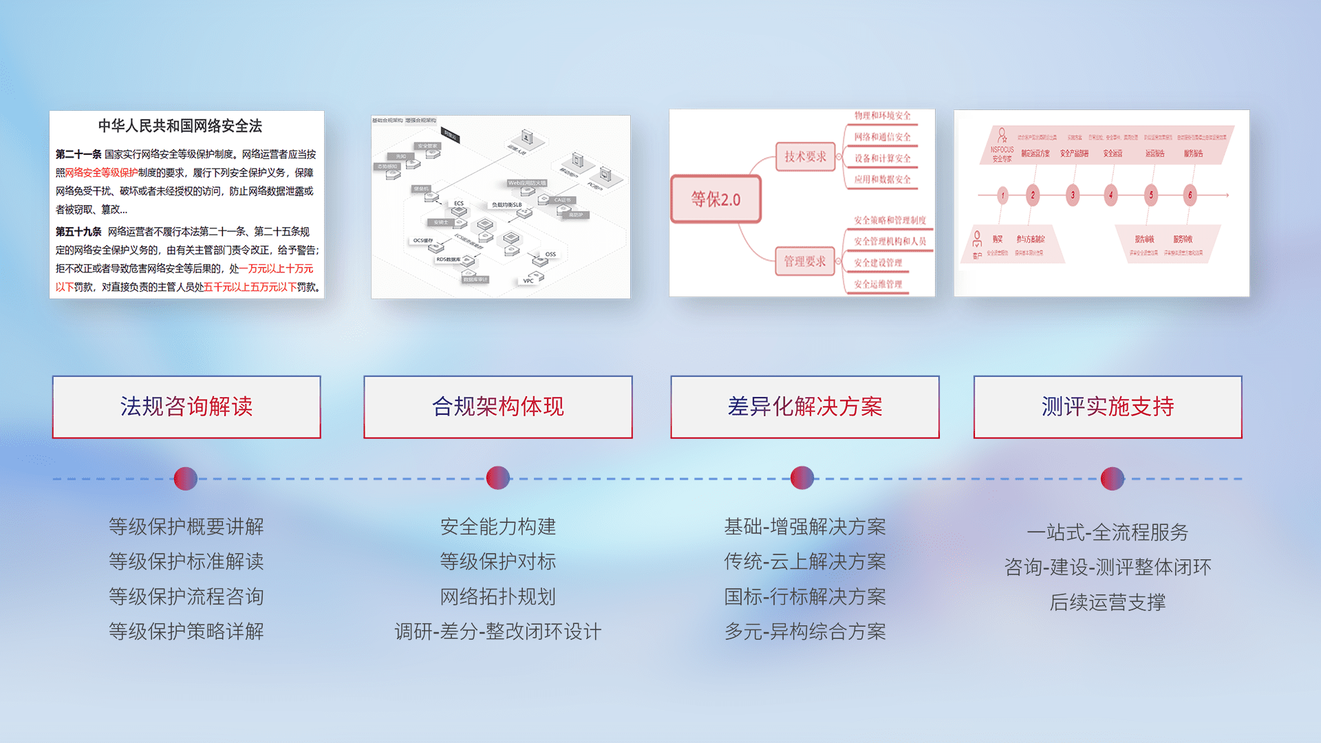 通过专业的法律咨询解读、、合规架构体现、、差异化解决方案、、、测试实施支持等服务,,为客户量身打造等保合规体系。。。。